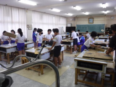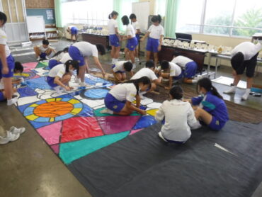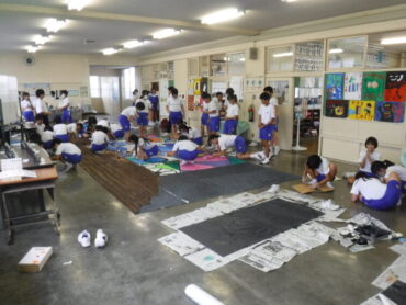 2025.9.18 6年生 学習発表会に向けて、準備を頑張っています~6年生~ 6年生が、学習発表会の演劇の準備をしました。 ☟ワークスペースでは、大きな紙に背景画を協力して描いています。 ☟家庭科室では、大道具や小道具の製作です。 どんな劇になるのか、楽しみです!